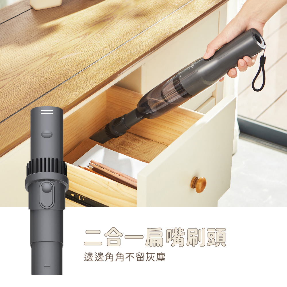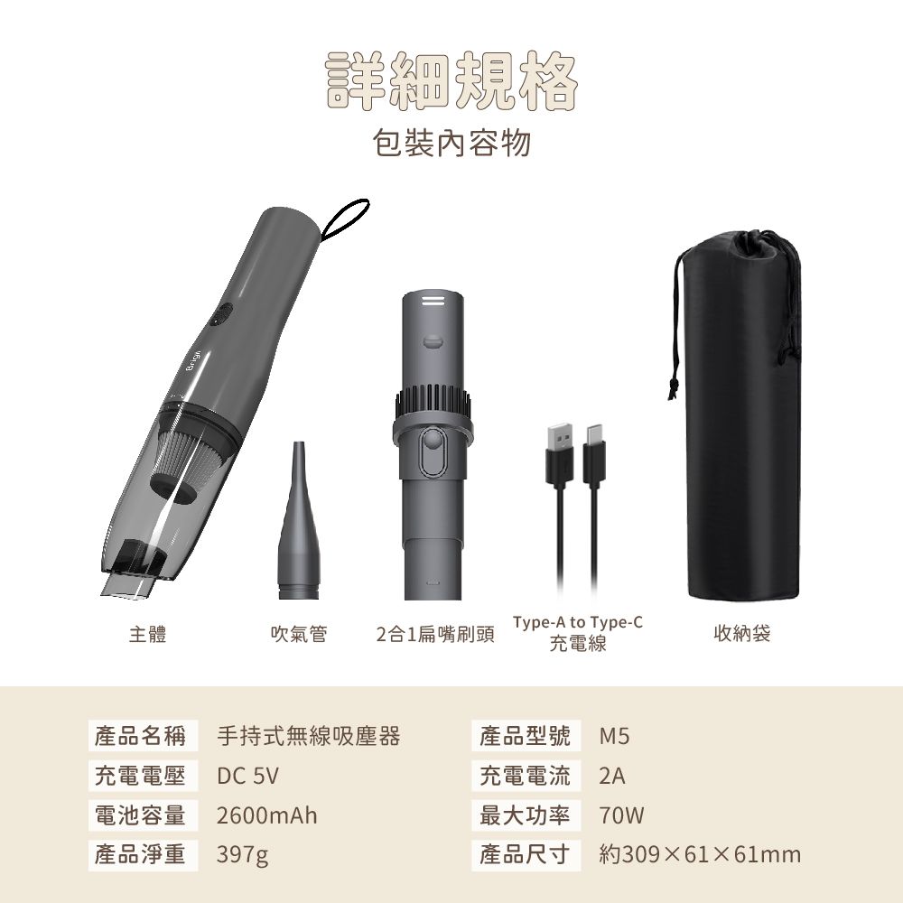 - 包裝內容物:M5手持式無線吸塵器×1、使用說明書×1、吹氣管×1、2合1扁嘴刷頭×1、Type-A to Type-C充電線×1、收納袋×1、掛繩×1