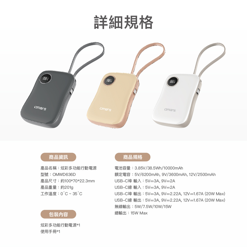 • USB-C線 輸出:5V⎓3A, 9V⎓2.22A, 12V⎓1.67A (20W Max)