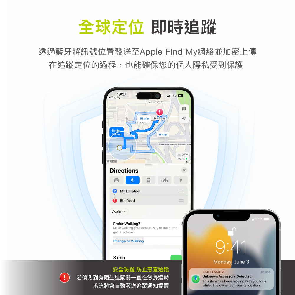 - 【反追蹤機制】▸安全警示防止惡意追蹤